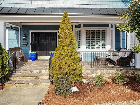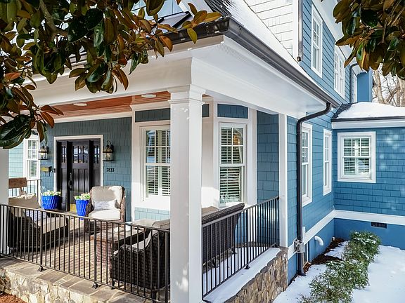 Midtown stunner in Anderson Heights blends craftsman architecture with transitional flair, offering quiet luxury at every turn. The front porch welcomes all with classic bluestone floor and tongue and groove ceiling —perfect for morning coffee or evening cocktails. Inside, the living room (currently styled as a music room) and formal dining room showcase hardwood floors that continue throughout all levels, along with plantation shutters and elegant designer lighting. The spectacular renovated kitchen features white cabinetry, quartz countertops, a gas cooktop with stainless hood, double wall ovens, and a wine fridge. It opens seamlessly to the family room anchored by a massive stone fireplace with gas starter and a wall of custom built-ins that leads to private deck. An ensuite bedroom on the main level offers a perfect primary suite option, complete with large walk-in closet and a luxurious spa-inspired bath featuring a clawfoot soaking tub, oversized walk-in shower, double vanity, and exceptional high-end finishes. Upstairs, a spacious landing leads to four additional bedrooms, including a second primary suite with a fully renovated bath with premier selections and his-and-her custom closets. Three additional bedrooms offer hardwood floors, generous closet space and the home's stunning lighting selections continue throughout. The finished basement provides versatility with two distinct recreation/sitting areas, a wet bar, and built-in cabinets/shelving—plus there is over 900 sq ft of coveted unfinished storage space. Outside, the upper deck overlooks a deep fenced backyard, while the lower brick paver patio is ideal for a firepit and entertaining under the stars. Unbeatable ITB location—walk to the Greenway, plus all the shopping and dining Midtown has to offer, with easy access to 440 and 40 for a seamless commute anywhere in the Triangle. This one lives large, shows beautifully, and checks every box.