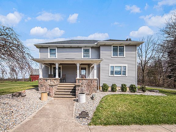 This beautifully maintained modern farmhouse combines century-old charm with today's comforts. An advanced closed-loop geothermal HVAC system eliminates the need for propane, while custom cabinetry, fireplace surrounds, and baseboard trim add a touch of elegance throughout. The spacious kitchen overlooks an in-ground pool and pond, perfect for relaxing or entertaining. With main-floor laundry, formal dining and living rooms, the home offers both convenience and style. A large main-floor office with fiber optic internet is perfect for remote work. A Trex deck and covered front porch provide ideal spaces for outdoor living. The lower level includes a versatile recreation room, and the property features two large barns, a 24x32 pole barn/workshop, and a pool house. Beautifully landscaped with a circular driveway, it's a true retreat. Plus, a 22KW automatic standby generator ensures peace of mind. A rare find blending modern efficiency and timeless appeal!