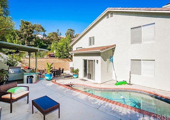 Gorgeously remodeled pool home perfectly located at the end of a cul-de-sac in Hillcrest Park Castaic. Impressive kitchen with light colored high-end granite counters, stone backsplash, stainless appliances & custom granite breakfast bar. Upgraded oversize tile downstairs, wood on stairs & upstairs area. Shutters & nice neutral paint throughout. PebbleTec pool/spa with large deck area & covered cook station. Very nicely done. Excellent curb appeal with newer exterior paint & garage doors. 3 car garage with potential boat parking on the side. Open floor plan with soaring ceilings, full bed & bath down + 3 up. Sharp!