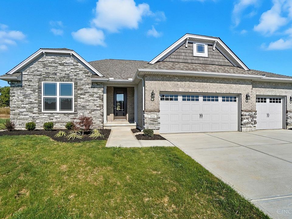 New Home Ready to Move In!, The Grand Turin Elevation D Being Built by Schmidt Builders on a small cu-de-sac street, 2,139 Square Feet, 3 Car Garage, is a Three Bedroom Ranch Style Home, Ideal for formal and informal Gatherings, Two Full Bathrooms, Rough-in Lower Level for Bathroom, Chef's Kitchen with Quartz Countertops and Large Center island that opens up to Great room, Gas Cooking range in Kitchen, Walk in Pantry, Breakfast Nook, Great Room with Tray Ceiling and Corner Stone Fireplace, Luxury Bathroom with double vanity, Ceramic tile shower with seat, 6 x 6 walk-in Closet, First Floor Laundry Room, 16 x 9 Covered Rear porch, Shaw Floorte luxury plank Vinyl Floors,The Home includes an unfinished lower level with nine foot ceilings Locate in Venice Crossing Development on Lot 85 in Ross Ohio. Should be Completed around September 2025