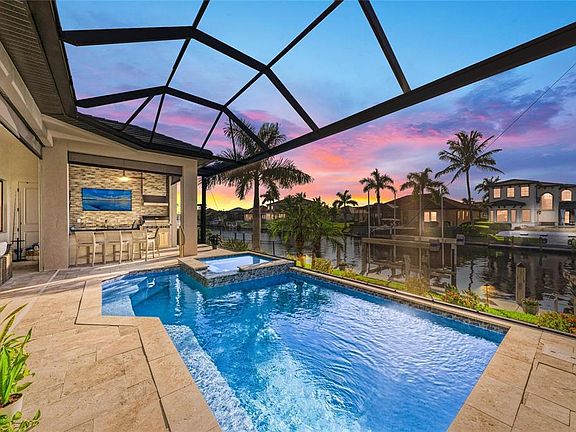 Heated pool and spaWide canalLarge center islandResort-style lanaiGuest suitesQuartz countertopsLuxury waterfront pool home