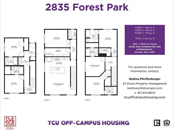 TCU housing at its best. There are 5 generous private bedrooms, each with a private bathroom. The common floor features solid surface floors, a balcony, large open living area with flat screen TV, powder bath, kitchen, laundry room / pantry with full size washer dryer and an additional room with endless possibilities. There are 2 bedrooms and full size washer / dryer on the 1st floor and 3 bedrooms on the 3rd floor. Parking is private, well lit, fenced and gated with a remote, off street, and onsite.
