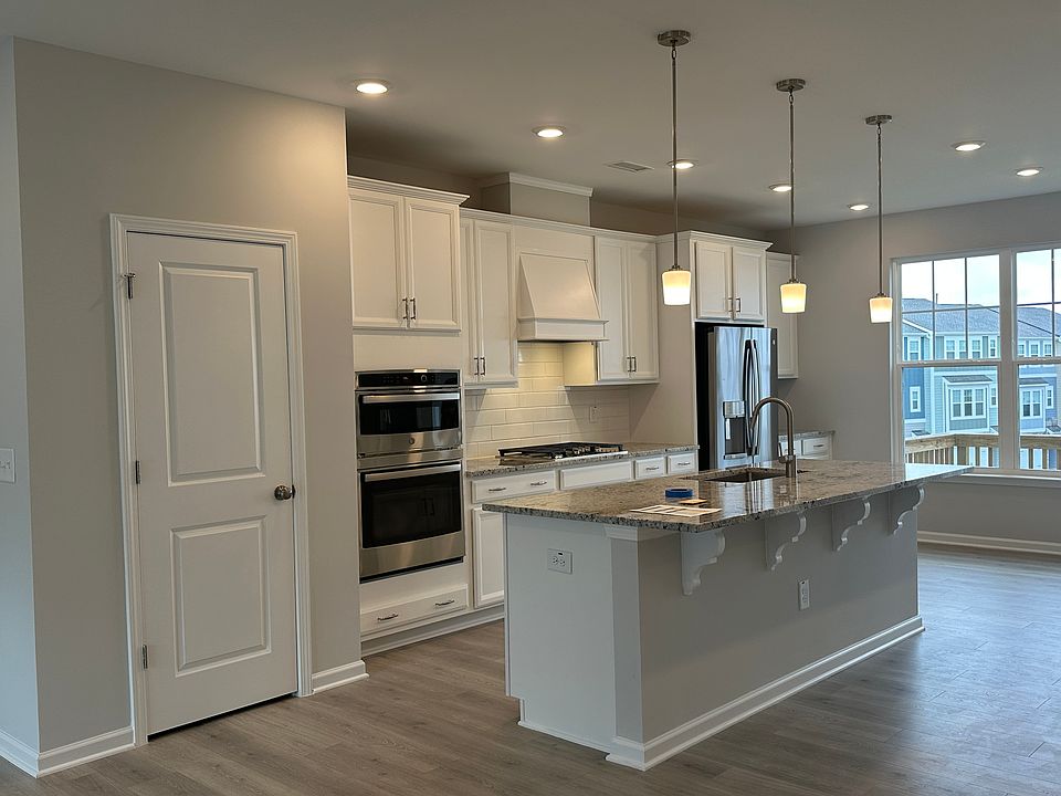 On the main (second) level, you'll find a stunning open-concept layout featuring a gourmet kitchen with granite countertops, 42" white cabinetry, a wall oven, gas cooktop, and GE stainless steel appliances. The large great room is perfect for entertaining, with direct access to a private deck.