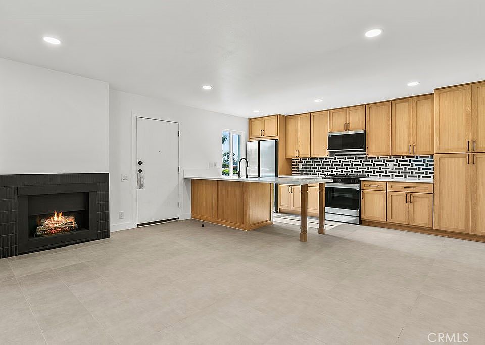 Welcome to this beautifully renovated 1-bedroom, 1-bath condo located in the sought-after Lakeshore community of Santa Ana’s vibrant South Coast Metro area. Thoughtfully designed with premium finishes throughout, this ground-level home blends comfort and modern style in a way that feels both elegant and inviting. Enter into a spacious open floor plan featuring new recessed lighting, a cozy gas fireplace, and a seamless flow between the living, dining, and kitchen areas—perfect for relaxing or entertaining. The fully remodeled kitchen is a true standout, showcasing sleek quartz countertops, custom oak cabinetry with matte black hardware, and a full suite of high-end Samsung Bespoke appliances. A large peninsula with seating for six offers both functionality and style. The bedroom provides a tranquil retreat with dimmable lighting and an oversized closet featuring custom floor-to-ceiling frosted glass sliding doors. The bathroom area continues the upscale feel, with coordinated cabinetry, a deep soaking tub with designer tile surround, premium Delta fixtures, and a modern vanity with framed mirror. Additional upgrades include all-new double pane windows, a sliding double pane glass door, central heating and air conditioning, and a patio perfect for morning coffee or evening unwinding.