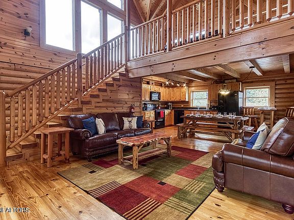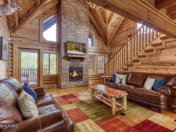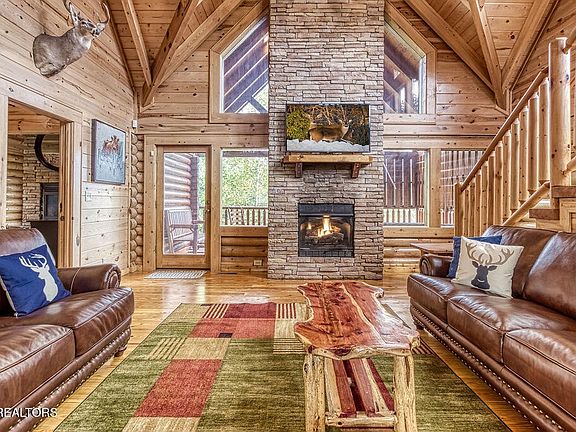 With $85,000 already booked for 2025, this meticulously maintained and thoughtfully updated 4BR/3.5BA log cabin blends timeless cabin charm with modern luxury and sits just a ten-minute walk from the heart of Pigeon Forge. The open concept main floor offers soaring vaulted ceilings, a stacked-stone fireplace, and large windows that flood the space with natural light. The kitchen showcases granite countertops, a handcrafted cedar dining table seating ten, plus bar seating for two. Step directly from the living area onto a covered private deck complete with a gas fireplace, brand-new large hot tub, and comfortable seating. The cabin features three master bedrooms with private ensuite bathrooms and a vaulted bunk room. One master suite includes a double-sided stacked-stone fireplace with a private jacuzzi tub. Spread across three fully finished levels are multiple entertainment zones, including a spacious multipurpose theater room with tiered seating and a game table, plus an upper loft with a pool table and multi-game arcade. Situated on a rare flat lot, the property features a private 9-hole mini golf course, charcoal grill, two decks, a newer roof (2022), newer gutters, (2021) a new tankless water heater (2024), full exterior staining completed in 2025 and newer flooring installed as well (2021). You can also rest easy about the furnishings, the entire cabin was refreshed in 2021 with all new furniture and mattresses, giving this spotless retreat a fresh, like-new feel. This amazing cabin has been meticulously maintained inside and out and benefits from city utilities with no HOA, offering straightforward ownership and excellent flexibility!