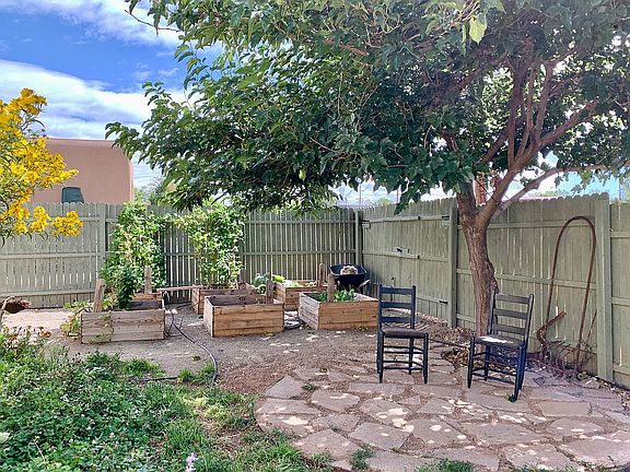 A rare opportunity for an in-town, affordable, four bedroom home! This pueblo style home features granite countertops in the kitchen and bathrooms, stainless steel appliances and gas stove, and built-in cabinets in the hallway as well as a large pantry and laundry area for ample storage room. The exterior has many mature trees, raised garden beds, and a rain catchment system within the fully fenced connected front and back yard. There is a portico in the back yard just outside the kitchen sliding doors. The location is convenient to shopping and dining, neighborhood parks, and public transit. Take a look at the 3D Virtual Tour in the links!