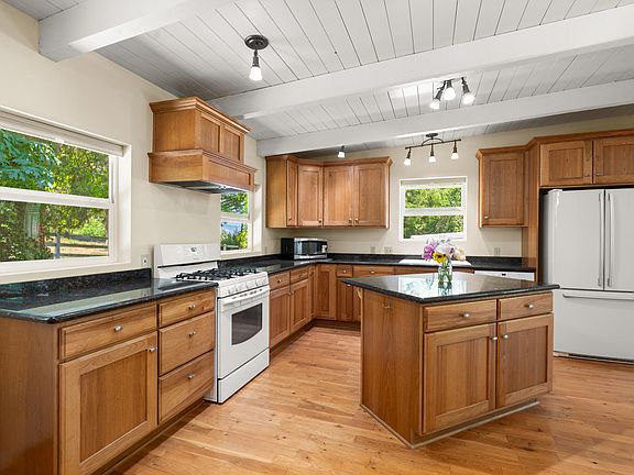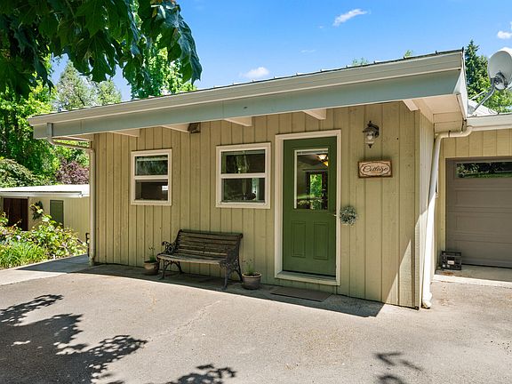 Searching for Privacy? You found it with this single-level, Mid-Century charmer on 1.54 acres with irrigation and Griffin Creek frontage. Conveniently located between Jacksonville and Medford, while still offering a serene country setting. Not only do you get a 3-bedroom, 3 bath house, but also a 1 bedroom, 1 bath with full kitchen cottage/ADU. Open-beam ceiling and hardwood floors in the cottage. The main home has hardwood flooring in the dining room and living room and floor-to-ceiling windows to enjoy the peacefulness of your surroundings. Updated kitchen and bathrooms sure to please. Also, there is a bonus room with vaulted ceilings that would make a wonderful bedroom or family room. The carport has enclosed storage and an 18X9 room perfect for an office or guest room. 20X20 shop, firepit by the creek, garden, and personal orchard w/apple, fig, pear, cherry and plum trees. You just can not find a more perfect place to call home. Get your appointment set to tour today.