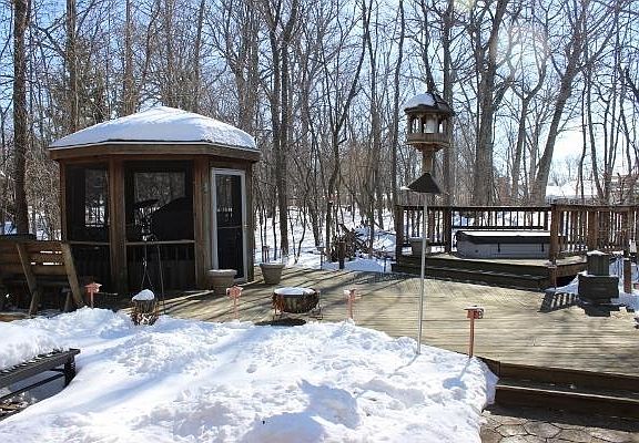 A great location for this cozy, private, four bedroom, two full, two half bath home on cul-de-sac. Wooded lot, deck patio, hot tub, gazebo, and shed, makes outdoor living at its best. Large eat in kitchen, lots of cabinets & granite counter space, large family room with bay window, built in storage and fireplace. Dining room, large living room with fireplace and bay window. Master suite with two closets and outdoor deck. Top notch finished lower level with wet bar and bath.