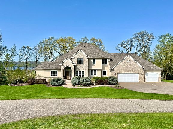 If you're looking for a classy home with a wonderful floor plan, numerous upgrades, privacy, acreage PLUS views of the Mississippi River and bluffs, then this is your dream property! Exquisite woodwork and decor make this an extra special place. 9' ceilings throughout the main level plus an open 2-story great room with floor to ceiling wood paneled fireplace with built-ins overlooks the backyard with beautiful views. Stunning kitchen and informal dining area with Cherry cabinetry, Brazilian Cherry flooring, granite countertop, and stone tiled backsplash. Another sitting room overlooking the backyard features a second fireplace with granite and Cherry. In the dining room, you'll find a tray ceiling trimmed with Cherry and accent lighting that adds ambiance. Also on the main level is a luxurious owner's bedroom suite with tray ceiling and views, a classy black chandelier and wall sconces, 3rd gas fireplace and private full bath with jetted tub and walk-in closet. Large main level laundry with cabinetry, mudroom with locker/cubby area for coats and shoes plus a huge walk-in closet. Upstairs, you'll find 3 more bedrooms with one currently being used as an office with window alcove and views. And, there's another full bath and a charming playroom in the hall closet. The walkout lower level boasts a gorgeous Cherry paneled family room and wet bar with Cherry beamed ceiling, beautiful cabinetry, granite, fireplace, TV, bar sink, wine cubby, microwave and wine and beverage fridges. In-floor heat throughout this level and a 5th bedroom, rec room, game room, 3/4 bath with tile, marble counter, sconces and custom cabinet plus a stylish alcove featuring decorative wall painting and wainscoting. Accent lighting on all stairs, heated 3 car garage with separate stairway to lower level, huge storage room with sink, cabinetry and workshop area, speaker system inside and out, Trex decking, multi-level paver patios, light posts and lush landscaping with numerous perennials, crabapples and mature trees. Septic system recently replaced and some trees in backyard had been removed since photos were taken.