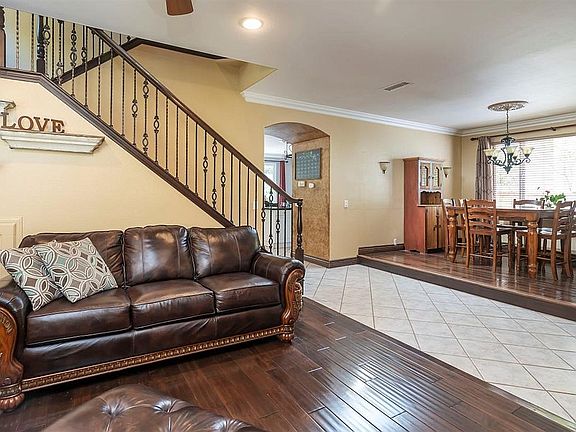 This spectacular Centex home is warm and inviting. The ambiance of the landscape and entry entice you to see the inside. The arched front door adds a touch of elegance and class. Enter, and be welcomed by the neutral warm colors, crown molding, upgraded baseboards with beautiful wood, and tile floors, and updated stairway balusters. Upon entering, the cozy living and adjoining dining rooms welcome you in. There is also a den which is being used as an office but could be a nice guest room. Walk past the staircase and enter the expansive kitchen which has the cook in mind and opens to the family room and dinette. The kitchen features ample cabinet and counter space, and the granite counters really contrast the white cabinets nicely while the newer stainless appliances add a touch of class. Upstairs you'll be amazed at the efficient use of space. You'll find a large loft with built-ins and 4 bedrooms! The master has a nice deck to relax on, perfect for any time of day, and enjoy the view. The 2 middle bedrooms share a jack-n-jill bathroom and the front bedroom has it's own bathroom. The gorgeous backyard has beautiful hardscape including built-in BBQ, cozy firepit, stamped concrete, and covered patio. The landscape in the backyard is a sight to be seen as well - truly a great for entertaining. You don't want to miss this home! With community pools, 2 tennis courts, recreation center, paseos, and an award-winning elementary school and junior high what else could you ask for?