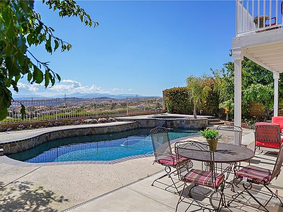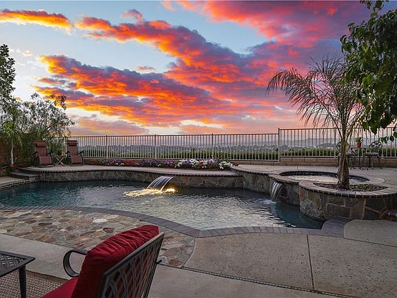 NO HOA!! NO MELLO ROOS!! Amazing Panoramic Mountain and City Light Views!! Private Pool & Spa!! Your breath will be taken away by the amazing view upon entering this beautiful open floorplan executive home. The backyard is your own private retreat; it has a sparkling pool and spa with waterfall, custom hardscape, covered patio, apple, asian pear, and citrus fruit trees and one of Santa Clarita's most spectacular views. The spacious living and dining room with custom tile is light and open. The Kitchen features granite counters and island with breakfast bar overlooking the dining nook and family room with a beautiful cozy fireplace and surround sound built in speakers. There is a full bedroom and half bathroom downstairs as well. The half bathroom has all of the plumbing ready to go from the original builder if you would like to add a shower. Master suite is upstairs and has it's own private balcony to enjoy the 180 degree views. The private bathroom features dual walk in closets, dual sinks, vanity, jetted tub and walk in shower. Two additional bedrooms, guest bath, spacious loft, office nook and laundry room can be found upstairs. This home is close to award winning schools, parks, shops and restaurants.