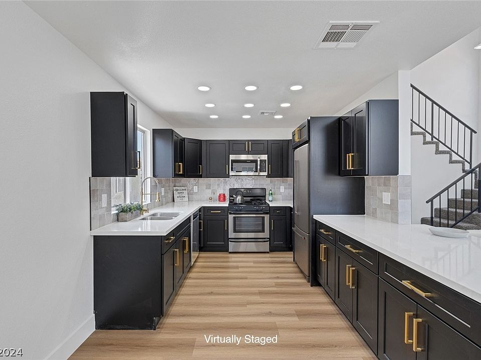Step into this stunningly upgraded 2-story, 3-bedroom, 2-bath home, featuring a sleek and modern aesthetic. The kitchen boasts elegant quartz countertops, high-end stainless steel appliances, and stylish black shaker cabinets with soft-closing features, making it a chef's dream. Throughout the home, you'll find freshly painted walls, chic 5-inch baseboards, and durable vinyl plank flooring that complements any decor. Both bathrooms have been meticulously remodeled, showcasing new custom tile showers that add a touch of sophistication. The two-car garage provides ample storage and parking space. This property has been thoughtfully upgraded to ensure a luxurious living experience. Perfect for those who appreciate fine details and modern comforts.