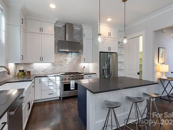 This is luxury townhome living in an unbeatable Myers Park location. This highly upgraded end unit offers fantastic curb appeal with a stately combination of brick and siding, accented by gorgeous windows. Inside, a front foyer leads to a landing with access to the main living level. It boasts a spacious living room with a fireplace, built-ins, and two Juliet balconies. There's also a flex space, currently a bar. The chef’s kitchen features cabinetry to the ceiling, a 36-inch GE Café gas range with vent hood, a roomy island, and walk-in pantry. It connects to the dining room and the screened back porch with a built-in infrared heater. Upstairs, you'll find two bedrooms and two full baths, including the primary suite with a custom walk-in closet and a bath with dual vanity, shower, and soaking tub. The laundry area is conveniently tucked between the two bedrooms. On the ground level, there’s another suite with a full bath, upgraded built-ins, and access to a covered lower porch with storage room, and the yard with low-maintenance artificial turf. A drop zone and two-car garage add extra convenience. Other upgrades include designer stair railings, hardwoods throughout (no carpet), top-tier bathroom vanities & tile, and customized window coverings (some motorized). With its end placement in the center of the community, you’re insulated from Park Road while enjoying incredible natural light throughout the day. Welcome home!