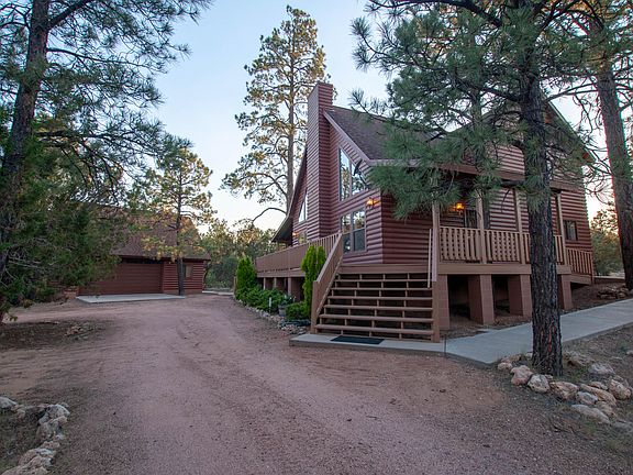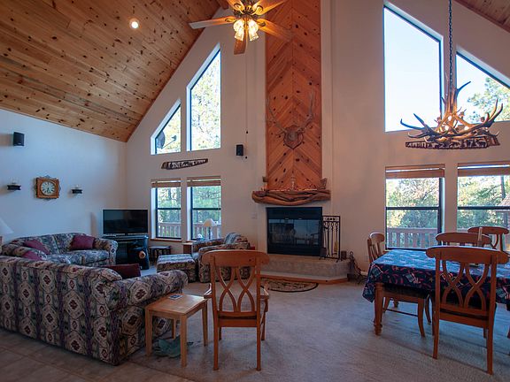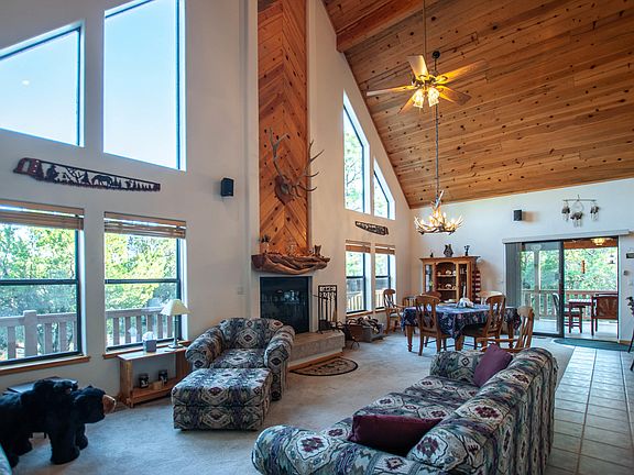 Well maintained chalet style cabin in the pines. Large open great room, soaring ceilings and wall of windows to enjoy the mountain views. Large wrap around deck & covered patio area to enjoy the mountain outdoors. Tall pines on almost an acre. Oversized 2 car garage with a potential guest quarters or bonus room upstairs. Mostly furnished.