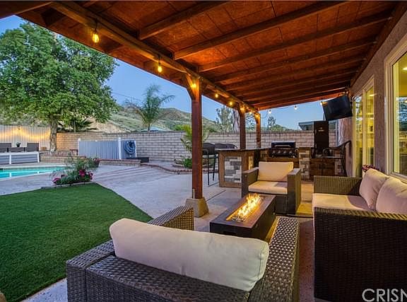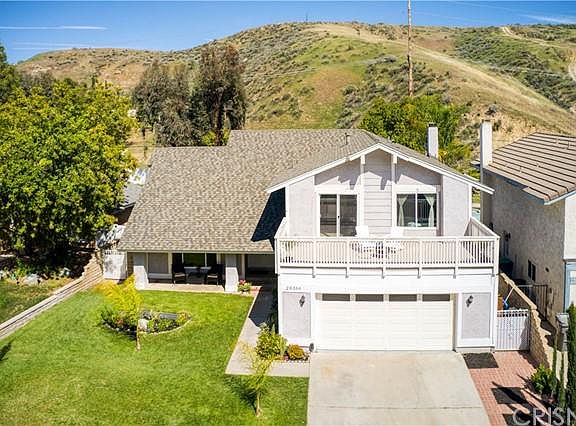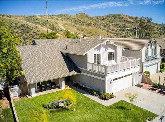 Welcome to this light and bright two story POOL home. This former 4 bedroom and 3 bathroom model home features upgrades and value above other properties in the neighborhood. The wonderful open floor plan hosts a spacious living room and formal dining area flooded with natural light and featuring soaring vaulted cathedral ceilings and flows to the beautifully updated kitchen overlooking the backyard and a large family room with its cozy fireplace and built-in cabinetry. The guest half bath, an interior laundry room, and an additional large storage closet complete the first floor. The four bedrooms upstairs are spacious and the front facing bedroom includes a sliding glass door that leads out to the balcony to relax and enjoy an evening sunset. The primary suite has hillside views and a remodeled master bath with double vanity. It's an entertainer's dream in the backyard with the sparkling pool and spa, grassy area, built in BBQ with bar seating, and the covered patio, perfect for dining outside and enjoying your pool and private space. The garage has parking for 2 cars AND two bonus rooms that have plenty of possible uses, gym, office, storage(fun fact this home is the original model for this tract and they were used as offices in the model home). Additional features include new dual pane windows, new roof, storage galore, freshly painted interior and exterior, a dog run, and a gorgeous pool/spa, all with no Mello-Roos or HOA!! This home offers Santa Clarita living at its best - come and see it today before this beauty is gone!