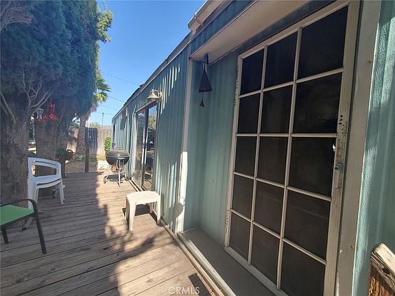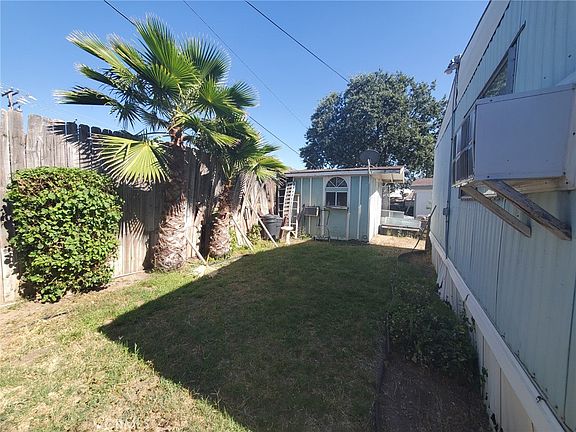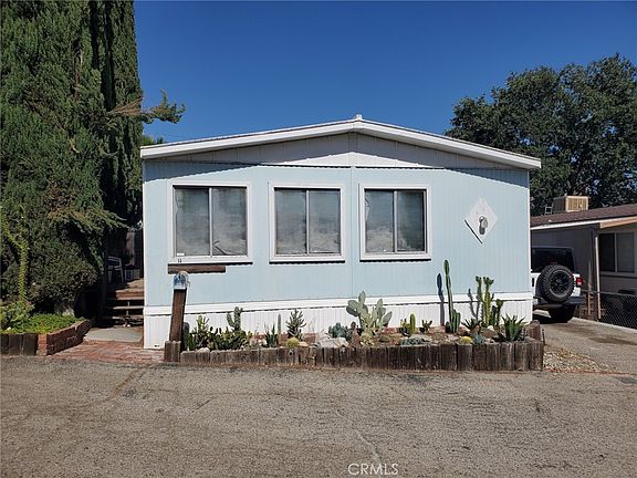 Welcome to this 2 bedroom 2 bath home in a family park, LOW SPACE RENT $765.89! This home features an inviting front porch, a fenced yard with sprinklers and a large shed. The rustic front porch is lined with Cypress trees which offer additional privacy. Walking into this home you enter into a large living room which is open to the dining room and has a built in hutch, ceiling fans and black out shades. The kitchen features new formica counter tops, retro black and white checkered flooring a garbage disposal and stainless steel appliances which include a range/oven, refrigerator and dishwasher. The kitchen is open to the den, which has a slider that opens to the front porch and has a ceiling fan along with a built in storage area by the front door. The primary bedroom has a large closet and an ensuite bathroom. The ensuite has been updated with new flooring, vanity, walk in shower, glass shower doors and a linen closet. The main bathroom has a shower/tub combination with a large vanity and extra storage. The other bedroom has a large closet and can accommodate a king size bed. The laundry room has a full size washer and dryer and leads to the carport side of the home. 3 cars can fit on the driveway side of the home.