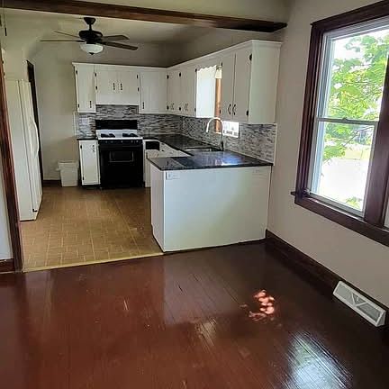 The living room features a large arched entryway into the dining room which opens into the kitchen. Range, fridge and dishwasher are included in the rental.