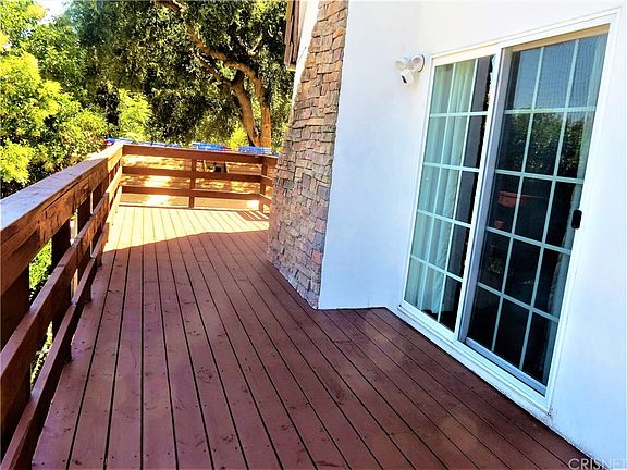 Move in ready 2,220 Sq.Ft. house in the City of Agoura Hills, which is served by the highly rated LVUSD school system and Malibu/Lost Hills Sheriff's Station. Newly repaired and painted wrap around large deck. 3 bedroom home with an additional appx. 440 sq. ft finished basement currently used for home theater with separate entrance. Basement could be used as home office or additional bedroom. No HOA. Appx. 20 minute drive to Malibu beaches. Showers remodeled with travertine tiles, new sliding shower doors, paint and crown molding. No carpet. Floor remodeled with laminate flooring. Other parts of the floor are tile. Stucco and stone in the front and sides of the house. Large two car garage with 2 separate new automatic garage doors. Appx. 460 sq ft. garage has direct access to basement. Large driveway with plenty of parking space. New energy efficient dual pane windows and patio doors. Entire interior, including full basement remodeled with new paint, crown molding and baseboards. New central HVAC, including heating furnace, cooling condenser, and new duct work and attic insulation. 8 new security Ring Central flood light cameras surrounding the house. Spacious master bedroom with retreat area, two standard closet, one walk-in closet, and sliding patio door access to a private balcony. Automatic sprinkler system serving the front yard and side yard trees. Kitchen with new stainless steel appliances and stone backsplash.