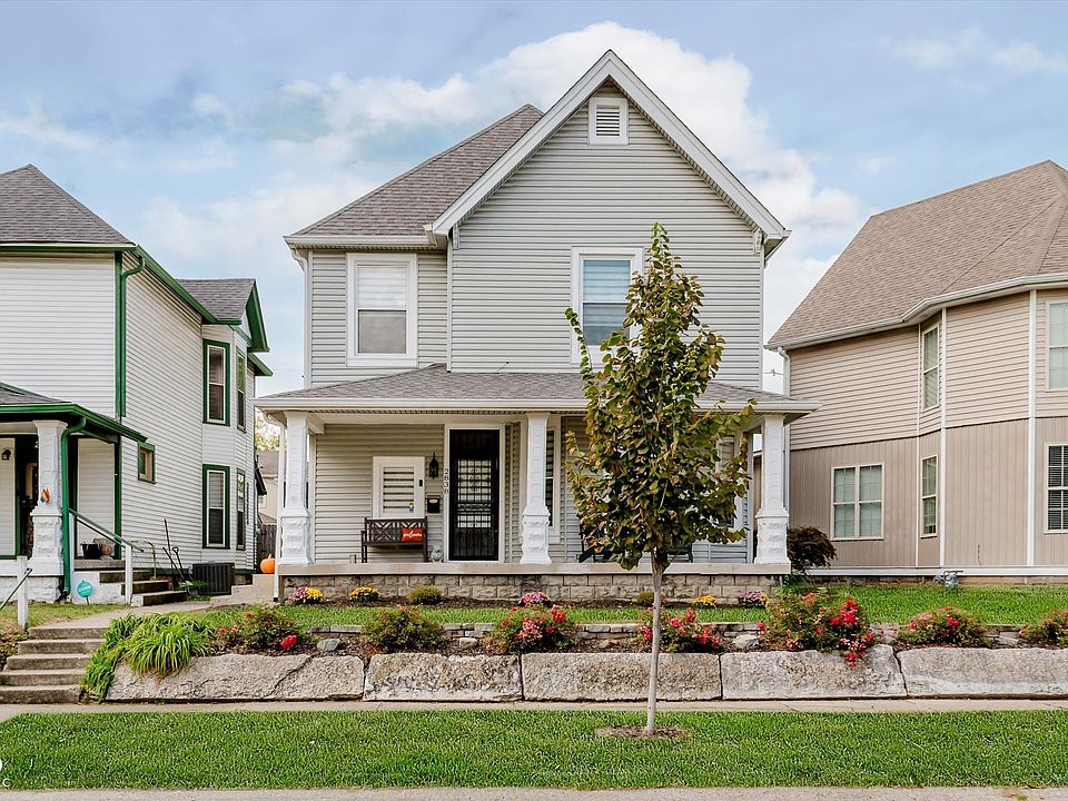 Nestled at 2838 Carrollton AVE, INDIANAPOLIS, IN, this charming 1920s single family residence, boasting 1950 square feet of living area spread across two stories, on a 4574 square feet lot, is in great condition, ready to welcome its new owners. This 3 or 4 bedroom, 2 full bath home is in one of Indy's most vibrant neighborhoods! Overlooking The Triangle (neighborhood park), this charmer is only steps away from The Monon Trail! Easy access to entertainment, such as The Garage, Mass Ave, Broad Ripple and downtown Indy. You'll be in awe of the Grand Entry with original staircase, beautiful custom original woodwork, original hardwood floors, built-ins and high ceilings throughout home. The dining room features a stunning Coffered Ceiling. Enjoy morning coffee on the expansive front porch, or hosting a summer barbecue in the fenced-in backyard. The pergola on the spacious back deck provides a shaded oasis for relaxation. Imagine preparing meals in a kitchen that combines classic design with modern convenience, featuring shaker cabinets that offer ample storage and stone countertops that provide a durable and elegant workspace. The natural textures and neutral tones create a calming environment, perfect for both everyday cooking and entertaining. This stunning completely renovated kitchen offers all new appliances, including brand new oven/range & garbage disposal. The main level is Flooded with natural light with an open airy feel. Upstairs, the primary bedroom offers a private retreat, complete with an ensuite bathroom for ultimate convenience and relaxation. The layout creates a seamless space for rest and rejuvenation. In addition, the primary suite has a large attached sitting/laundry/bonus room (perfect for a large walk-in closet). *Windows are newer high efficiency. *Spacious 2 car detached garage. *Fenced in backyard for your furry friends. *Interior freshly painted. *Washer and Dryer included. *Roof is less than 5 years old. *Professional hardscape in fron