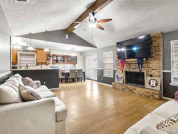 This beautifully maintained 3-bedroom, 2-bath home features an open floor plan and stylish laminate flooring throughout. The large living room boasts vaulted ceilings and a stunning wood-burning fireplace that serves as an inviting focal point. The galley-style kitchen offers ample cabinet and drawer space, perfect for all your culinary needs. The primary suite is thoughtfully split from the other bedrooms for added privacy and includes a beautifully tiled ensuite shower, and a sizable walk-in closet. Both additional bedrooms are generously sized and offer excellent closet space. Step outside to enjoy the expansive covered patio—ideal for relaxing or entertaining—overlooking a large backyard with plenty of room for play, gardening, or gatherings. This home is the perfect blend of comfort, style, and functionality. Don’t miss your chance to make it yours!