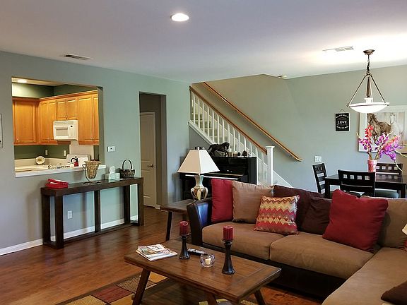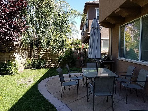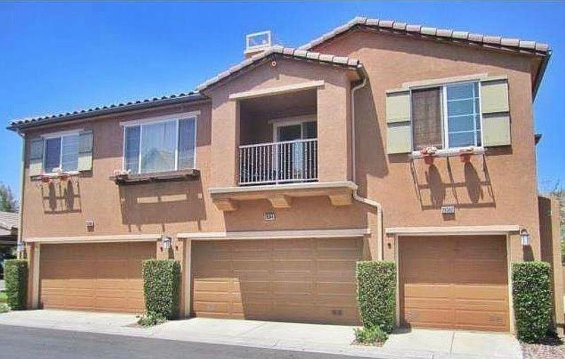 Fabulous location within the highly desirable Mariposa community nestled in the beautiful hills of the Santa Clarita Valley in Southern Sunny California, about 40 miles north of Los Angeles. This large newer two level unit has 3 bedrooms and 2 1/2 baths. Close to the resort style swimming pool, Jacuzzi, clubhouse or and playground with tot lot. The first floor has high ceilings, spacious living room with beautiful rich laminate wood flooring, fireplace and an entertainment nook. Premium wood cabinets throughout the home. Tiled kitchen with plenty of cabinet space and breakfast area. The dining area opens to the large landscaped oversized backyard with lovely mature trees, a tranquil water fountain and stylized stamped concrete patio; perfect for relaxing and entertaining. Downstairs 1/2 bathroom with wainscoting, laundry room and 2 car direct access attached garage with overhead bike pulley system for storage. Upstairs is a computer/media nook with built-in cabinets, 3 bedrooms and 2 full baths. The Master suite includes an oversized bathtub, his and hers sinks, walk-in closet and a beautiful view of the trees and mountains. Two additional bedrooms with plantation shutters and ceiling fans. Award winning school district, very low HOA dues of only $150 per month, and NO MELLO ROOS taxes. VA approved! A reat place to call Home!