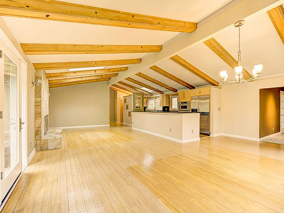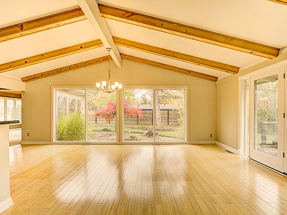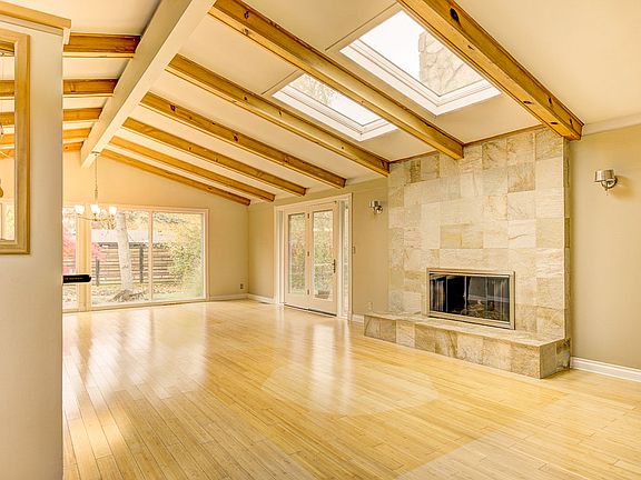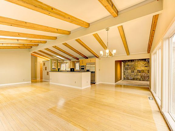 Stunning contemporary ranch in Troy with an open-concept layout, vaulted ceilings, and incredible natural light throughout. This beautifully remodeled home features hardwood floors, skylights, and exposed wood beams across a spacious great room with a stone fireplace and large windows overlooking the backyard. The sleek, modern kitchen offers high-end cabinetry, granite countertops, stainless steel appliances, and a unique layout that opens seamlessly into the dining and living areas. A separate family room features a cathedral ceiling, slate accent wall, and huge windows for even more flexible living space. Three bedrooms and two full baths include a primary suite with its own en suite bath, and a second bedroom with a massive walk-in closet. The hall bath features a jetted tub for relaxing at the end of the day. Enjoy a beautifully landscaped, private backyard with a large patio, storage shed, and mature trees. Bonus features include a spacious laundry room with storage and an attached two-car garage. Welcome Home!
