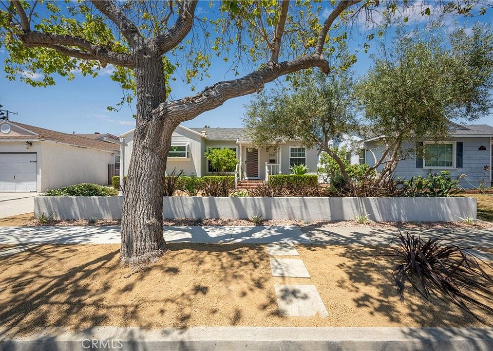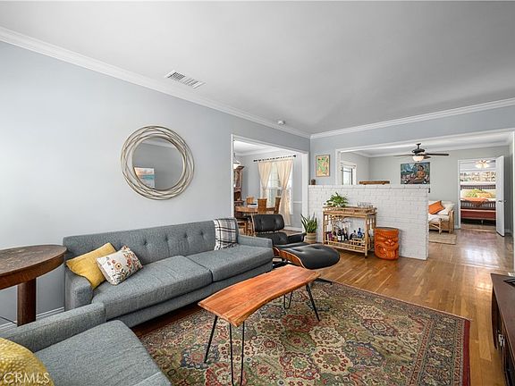 This charming 3 bedroom 2 bath home on a tree lined street is filled with surprises! The kitchen has two dual pane garden windows which fill the room with natural light. In the evening, pendant lights make this spacer nice and bright. The high end appliances include a stainless refrigerator, gas range, oven, built-in microwave, newer dishwasher, and wine cooler refrigerator. There's a ceiling fan to keep it cool when cooking. Of course, you can always turn on the central heating/air-conditioning! There are bright white cabinets (one has a lazy susan for easy access) and a large pantry. The ceramic flooring is easy to maintain. To top it off, a full sized newer high end Samsung washer and dryer are close at hand. The living areas have the original hardwood floors, mullion windows, multiple ceiling fans and crown molding, which all lend warmth to this freshly painted home. The master bedroom has a walk-in closet. Both baths have been updated. The master bath has dual sinks, tile shower and bidet toilet. The second bath has a new vanity and combo tub/shower for those who like a nice soak! There is a linen closet in the hallway and a coat closet near the living room. A sliding door from the family room leads to the generous size private outdoor area and a charming dutch door provides easy access to the kitchen. A special treat awaits outside-your very own TIKI BAR! This fun entertainment center is built on rollers, so you can move it anywhere you'd like in the yard. Part of the back yard is covered and the sunny side contains avocado, lemon, lime and orange trees - very California! If your kids spend the day surfing or sunning at the beach and come home sandy, there is an outdoor shower! The secure gated driveway provides extra space and leads to the two car detached garage with remote opener. An added bonus, a charger for your electric vehicle! Don't miss this move-in ready gem located in a great neighborhood! Note to the buyer: The seller did an inspection before listing the property and took care of everything that needed to be fixed.