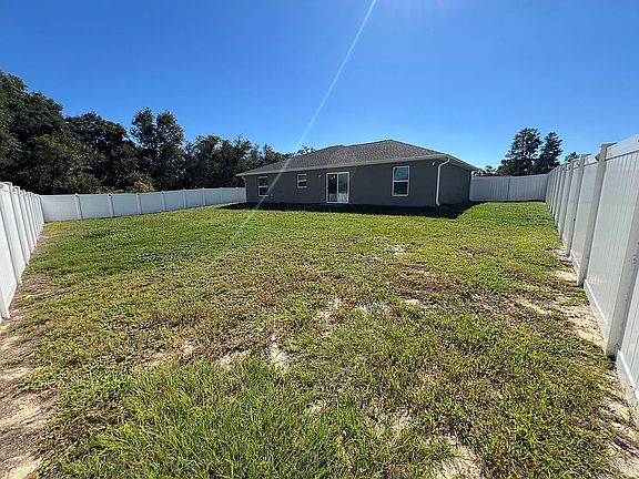 Welcome to this beautifully maintained 2023-built home located in the desirable Marion Oaks community! Featuring 1,557 sq ft of modern living space on a spacious 0.27-acre lot, this 3-bedroom, 2-bath home offers an open-concept layout with vaulted ceilings and luxury vinyl plank flooring throughout the main living areas. The kitchen includes stainless steel appliances, shaker-style cabinetry, and a large breakfast bar that opens to the living and dining areas. The private primary suite features a tiled walk-in shower, dual-sink vanity, and generous walk-in closet. Enjoy outdoor living in the fully fenced backyard with a 6-ft vinyl privacy fence and gutters added in 2023. Conveniently located near I-75, SR-200, shopping, dining, and local parks. No HOA—deed-restricted community.