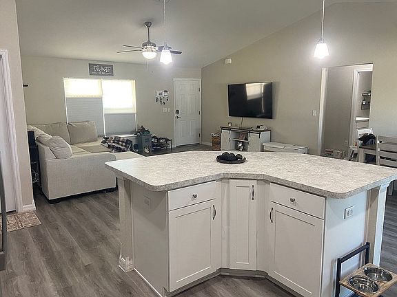 Shaker-style cabinetryLarge breakfast barVaulted ceilingsTiled walk-in showerStainless steel appliancesDual-sink vanityFully fenced backyard