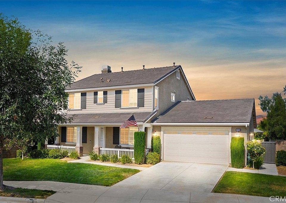 Welcome to this BEAUTIFUL Heritage Lakes, Menifee Home, the one you've been waiting for! Being offered by the original owners, it has a welcoming large front porch that's perfect for morning coffee. This stunning 3044, Sq. Ft. Residence is situated at the end of a quiet cul-de-sac with only 1 neighbor to the left and a serene park-like setting being surrounded by a greenbelt to the side and rear. Featuring 4 BD and 3.5 BA, this 2-Story Beauty has a Living Room, Formal Dining Room, Butler's Pantry, Kitchen-to-Family Room, Casual Kitchen Dining area, a Bedroom and Full Bathroom and a half bath all downstairs. Upstairs it has 2 Additional Bedrooms, two Full Bathrooms, an Individual Laundry Room with a sink, a built-in media / desk area and a Large Primary Bedroom. The OPEN FLOOR PLAN Kitchen is the HEART of the home where family gathers for Meals, Movies and Memories! It has a Breakfast Bar attached to the center island, granite countertops, ample cabinet storage and countertop space, a double oven, 5-burner cooktop and all stainless steel appliances. The Family Room is a spacious spot to chillax and watch a movie by the brick fireplace. The convenient downstairs Bedroom and Full Bathroom is perfect for in-laws, or guests to stay in. The 2 Bedrooms upstairs are good sizes and have nice closet spaces. The Primary Bedroom has a Private Bathroom, with a stand-up shower, sunken tub, dual sinks and private toilet room. It has a walk-in closet that feels like the size of a small bedroom. The Pool Sized lot in the backyard is well planned with a 2 tiered alumawood patio cover with a ceiling fan and lights, multiple sitting and gathering areas, mature trees and shrubs, an artificial grass play zone, and a dog pen for your furry friends. It could easily accommodate a large family party, is perfect for summertime BBQ's or a game of Cornhole! The Garage is 3-Car (tandem) with plenty of storage space. The HOA community is amazing and has 2 pools, the main pool has a splash park, playgound, and paddleboats and the Second pool has a children's wading pool. There is a clubhouse that can be rented for events, seasonal planned festivities, 2 parks within walking distance (Sunrise Park and Discovery Park), a Sports Park with Basketball courts, playgounds, a soccer field and tennis courts. The community is perfect for those who love to be active and outside. Mesa View Elementary and Chase Middle School are nearby. This home is in excellent condition and ready to Move right in!