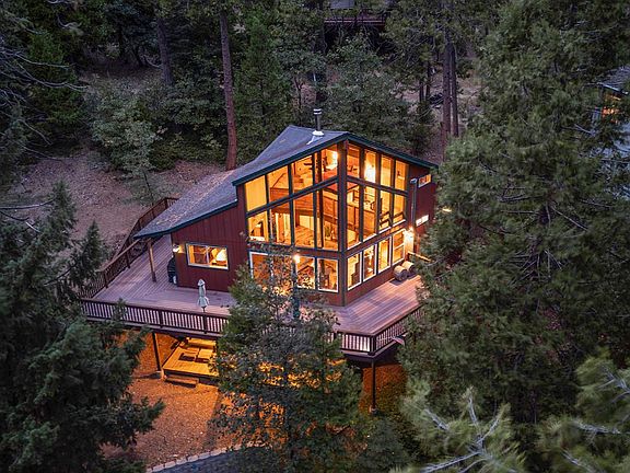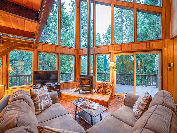 Upper loftSurrounded by towering pinesTowering windowsStunning clear-heart redwoodOpen-concept great roomCozy wood stoveNewer flooring