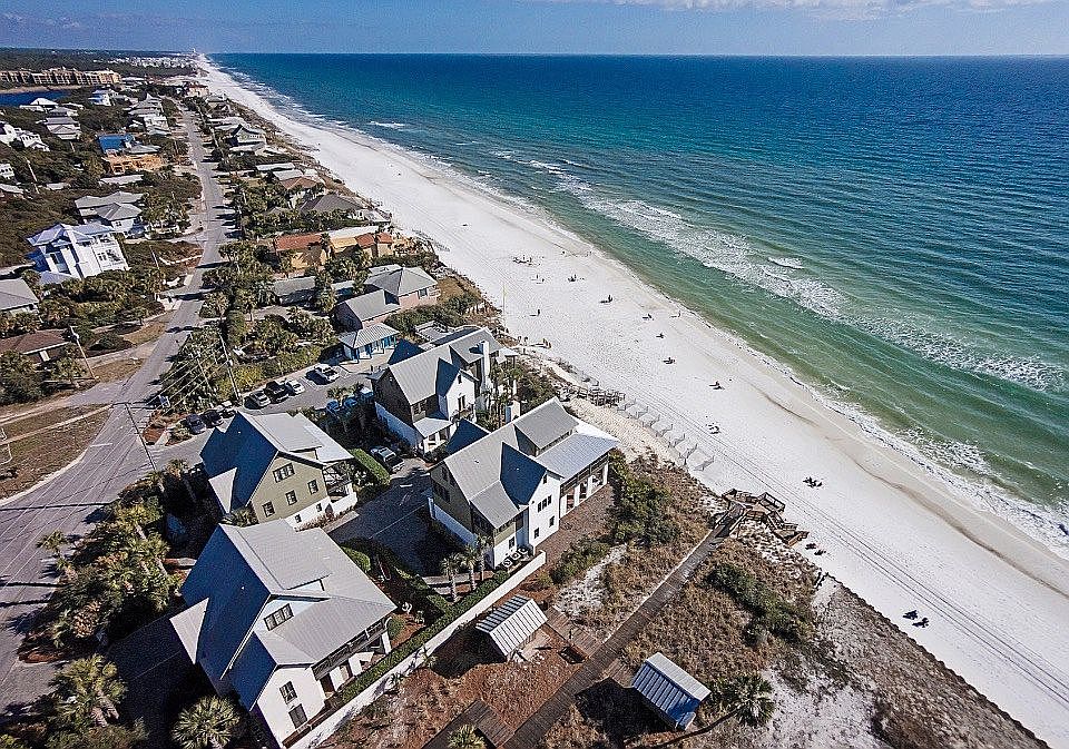 INCREDIBLE GULF VIEWS FROM THIS WRAP-AROUND PORCH...might as well be gulf-front! Built by award-winning Davis-Dunn and designed by the renowned firm Savoie Architects, this quality-constructed, second-tier home is located in a gated enclave south of Highway 30A and Blue Mountain Road in Blue Mountain Beach. Situated between the Blue Mountain Beach Access at Highway 83 and the private beach access for Redfish Village, this home offers three open fabulous, preserved Gulf views to the southeast, the south and southwest! This exclusive neighborhood consists of four homes sharing extremely convenient private, gated beach access with comfortable covered and padded benches oceanfront, just outside the door. New commercial grade Aluminum Standing Seam roof installed with fasteners upgraded to current hurricane code requirements, as well as lightening rod/weathervane. Exterior and decks were fully repainted in summer of 2021 with 2 coats of Sherwin-Wlilliams’ Emerald Rain. New Whole-house 38K Watt GENERAC generator. Also an upgraded irrigation pump and additional landscaping installed. Upon entry to this lovely three-story residence, you are greeted by stained and scored concrete floors on first floor, two guest rooms that sleep a total of 6, two full baths and a generous laundry room with ample counter space and over-sized sink. A beach-friendly outdoor shower is located off the laundry room, which is tiled floor-to-ceiling and includes a generous number of deep-access storage shelves. There are also built-in cabinets for additional storage under the stairs, which includes a cozy sleeper. Take the stairs to the 2nd floor, and beautiful wood floors accentuate the professional interiors decorated by Susan Lovelace. The open second-floor living space features a friendly living room lined with multiple French doors leading to the wrap-around balcony, an upgraded kitchen including granite counters and Viking appliances and inviting dining area. The master bedroom is situated on the southwest corner of the home offering privacy, magnificent Gulf views with full access to the porch and has two separate, fully-equipped his and her baths. One houses a walk-in shower and steam, while the other offers extended counter space and a free standing claw-foot tub. The third floor has two additional guest bedrooms with excellent three-way Gulf views and full baths. The fourth bedroom sleeps two. While the fifth bedroom also sleeps two, it is additionally capable of serving as a study with a huge custom designed built-in desk with granite top. The third floor also features two separate heated, cooled and finished spaces that also serve as additional, fully finished overflow sleeping spaces for mini-bedrooms 6 and 7, perfect for children, young adults or as supplementary storage in addition to the attic. The home will comfortably sleep 15. HOA fees are only $650/quarter and include landscaping. Pool: There is room for a pool with approval of 3 owners.