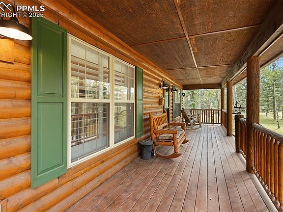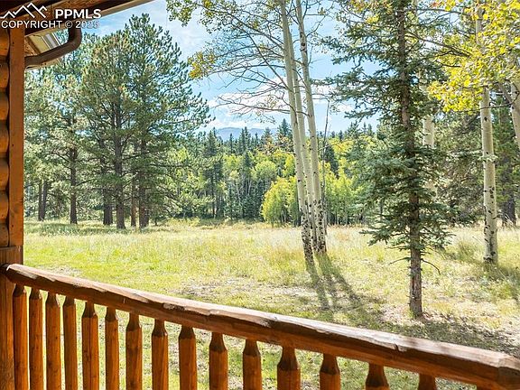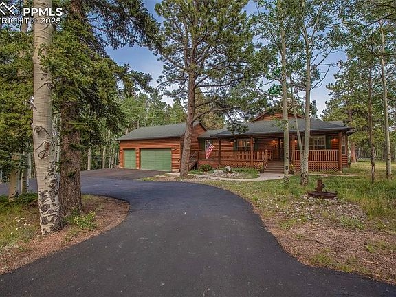 Private 8.5 acre mountain preserve on an idyllic setting of aspen trees, views of Pikes Peak, usable acreage with a blacktop driveway! Rustic mountain home completely remodeled including covered front deck, with new features including: Hickory hardwood flooring on the main level; custom plantation blinds throughout; new Hickory cabinetry and granite countertops + butcher block island, farm sink and new stainless steel appliances. Living area features a Jotul wood-burning stove, views overlooking Pikes Peak to the Southeast; main level laundry along w/ a Butler pantry; dog shower and a large doggie door; Main level owners suite also includes Hickory flooring, adjacent the remodeled primary bathroom with double vanity, jetted tub, a walk-in steam shower with dual shower heads, + a walk-in closet. 3 additional main level bedrooms w/ newer carpeting, in addition to a remodeled full bath. The lower level includes 9 ft. ceilings, a comfortable family room includes a corner gas fireplace, an adjacent office space, in addition to a non-conforming bedroom. Wonderful unfinished storage area/exercise room also equipped with a “safe” room or possible wine cellar. There is an expansive back yard deck, great for entertaining, and freshly stained; additionally, a custom-built pavilion on a concrete pad w/ a freestanding fireplace and 6 person hot tub. Fenced in yard for pets too! Mechanical updates include a new furnace in 2023, all natural gas appliances. Wander the trail system on the property to find an insulated treehouse and riding track for the kids! Parcel has no covenants or HOA, and includes an excellent 4 gpm well!