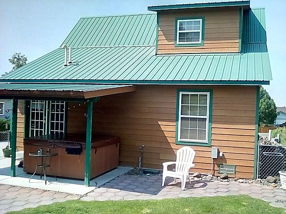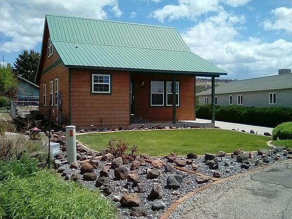 Cute home with cabin feel right down to the river rock fireplace (electric) hearth. Open living room with high ceilings, one bedroom and bath downstairs, loft is used as second bedroom and has its own bath. Lovely covered back patio with hot tub and additional custom landscaped stone patio with fenced back yard. Detached one car garage also has shop area and extra hang out room. Storage shed in back has a second floor with extra shelving. Beautiful view of the Grand Mesa mountains and the stream below.