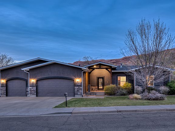 Downtown Chic! Discover modern luxury in the heart of Moab with this stunning two-level home. Featuring gleaming Southern Red Oak floors, a sophisticated kitchen with brass accents, quartz countertops, and a six-burner stove, this home blends elegance and comfort. The main level includes a primary suite with a spa-like bath, two additional bedrooms, and a stylish den. The lower level offers four bedrooms, two baths, and a spacious family room perfect for entertaining. Enjoy a beautifully landscaped yard with a fire pit, garden beds, and a covered patio. The oversized four-car garage completes this masterpiece of design and craftsmanship.