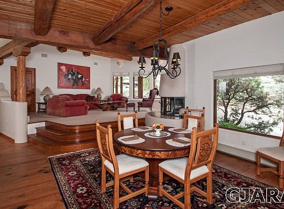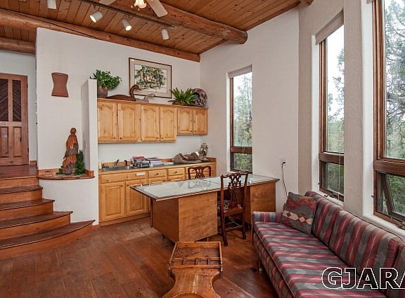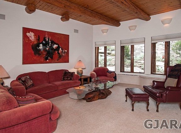 A private drive leads to this amazingly crafted Southwestern style home in a unique setting at the base of the Colorado National Monument. This home was designed to blend with the surrounding landscape. Tucked away on an 3.6 acre lot bordering the Monument, this property offers complete privacy and serenity. Rough cut beams and tongue & groove ceilings accent inside and out. Multiple outdoor living spaces and walls of windows offer incredible views. Wooden windows, saltillo tile, plank flooring & kiva style fireplaces complete the southwestern flair. The home includes voluminous closets and great crawl space storage. Multiple studio and office spaces provide privacy and panoramic views. Never before on the market, this is a once in a lifetime opportunity.