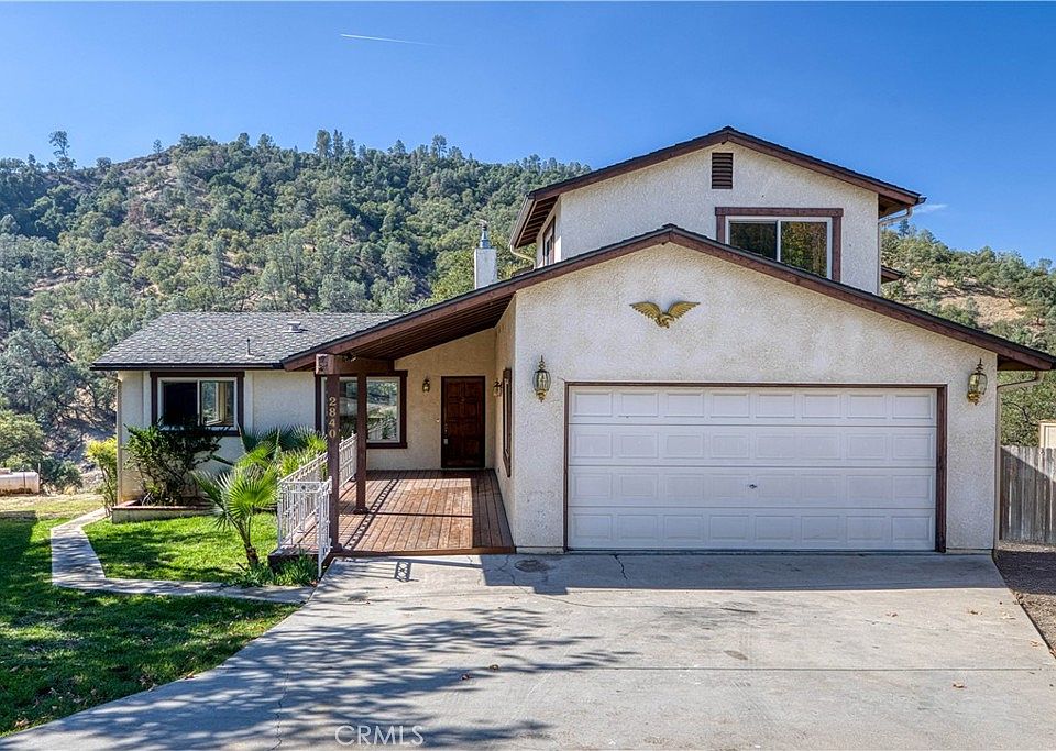 Located within the gated community of Heritage Ranch, this spacious split-level home offers 2,268 sq. ft. of interior living space including 4 bedrooms and 2 baths, plus multiple decks to take in the beautiful views of the tree-covered hills. The main level features a comfortable living room with a fireplace that opens to the dining area and kitchen, creating a warm and inviting space for entertaining. Step out onto the deck off the living room to enjoy peaceful views of the surrounding countryside. Up a short flight of stairs is the expansive primary suite with private deck and en suite bath with a large walk-in closet. A few more steps lead to an additional bedroom that could easily serve as a family room, office, or den. The lower level includes two more bedrooms, a full bath, and a laundry area—ideal for guests or multi-generational living. The attached 2-car garage provides ample parking and storage, conveniently accessed from the main level. Just behind the house is designated open space with a seasonal creek that meanders from the lake through the canyon. Enjoy the Heritage Ranch lifestyle with access to Lake Nacimiento recreation, and just 20 minutes from downtown Paso Robles with its fine dining, boutique shopping, and world-class wineries.