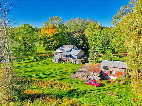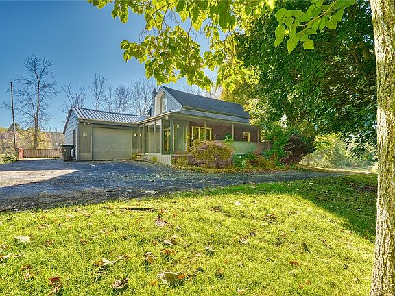 What a fabulous setting!! Wrap around porch with slider into house, living room, first floor bedroom, and huge kitchen/dining room area! Dining room overlooks back yard and opens to deck. (Deck needs work!) First floor laundry and full bath. Upstairs are 2 bedrooms. Full basement has good storage. New wood siding and metal roof in 2015. Furnace is 4 years old. Hot water tank age unknown. All appliances remain. Well is drilled and is to the side of house near driveway. Septic is to the right of the house. 2 outbuildings! 1car garage attached to house. Seller would like all contents to remain except some personal items. Being sold as is, where is. House needs a LOT of work!! Bring all offers!! Bring your creative ideas!