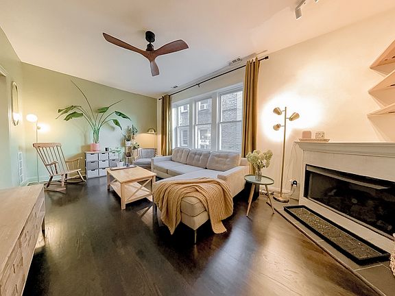 Discover this charming split-level townhouse-style condo, nestled in a quiet 6-unit building on the border of Avondale and Logan Square. This beautifully renovated duplex-up home offers approximately 1,100 sqft of thoughtfully designed living space with a blend of vintage charm and modern conveniences. Enter through the convenient walk-up to find a spacious living room bathed in natural light from southern-facing windows, complete with ebony oak hardwood floors and a cozy gas fireplace. The galley-style kitchen features granite countertops, stainless steel appliances, and a custom-built pantry, opening to a north-facing dining room that is perfect for entertaining. Upstairs, you'll find two bedrooms with ample space and natural sunlight, along with a custom office landing and a second full bathroom. Modern comforts include central heating and air conditioning, a new Samsung Laundry Tower, and a private basement storage unit in a building common area. The home is ideally located just steps from Kosciuszko Park, Brew Brew Coffee, restaurants and the CTA bus stop, walking distance to the Cermak grocery store, Binny's, Petco, and more. Transportation options are abundant with a 15-minute walk to the Blue Line or a quick hop on the Diversey bus at the end of the block, dropping you off at the Logan Square Blue Line stop in just 10 minutes. This condo offers the spaciousness and comfort of a house thanks to its unique layout, with the added benefit of a beautifully maintained garden enhancing the property. This is a great opportunity to own in a hot area and enjoy all the amenities that Logan Square has to offer. Don't miss out on this unique opportunity to own a piece of Chicago's vibrant Avondale-Logan Square community!