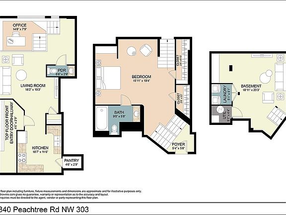 The main entry floor features a welcoming foyer and an open layout framed by lofty windows showcasing mature treetops. The upper level opens to a sunlit living area and kitchen, with a powder room and walk-in pantry adding everyday comfort. Between the two, a home office landing provides the perfect workspace, bathed in natural light—a nod to Brooklyn-style loft living in the heart of Buckhead.