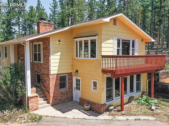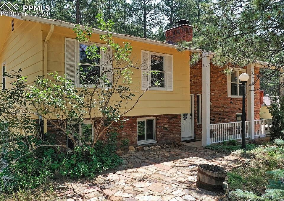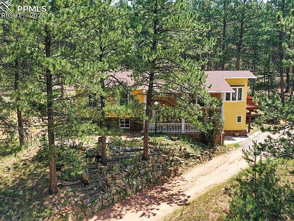 An outstanding close-in 3 bedroom, 2 bath, 2424 square foot Woodland Park gem on 4.26 acres awaits your arrival! 4 north miles of downtown Woodland Park this bilevel home with many amenities is bordered by Pike National Forest. Hike out of the backyard 200 yards to the fabulous Red Rocks Group Campground. A lovely loop trail along Trout Creek begins ½ mile away. Bike, hike, or ride to town or north to beautiful Manitou Lake on a paved path adjacent to the home. A perfect horse property! Gold Medal Trout fishing along the South Platte River is a short distance away. A custom local stone paved front porch overlooks a verdant and fertile mountain meadow complete with a rustic barn and aspen grove. Extensive local stone landscaping provides great areas for planting natives and succulents. Excellent privacy here with a fenced backyard perfect for your dogs, a covered back porch, and a balcony nestled in a mature ponderosa forest. Detached two-car garage with extra shop space, and extra parking space for an RV. This property also features a lower level sunroom with a water source and ample space for growing plants with a potting shed. The upper level features a large custom moss rock fireplace of great heating efficiency in the living room built by the talented stone mason Elmo Hammer. The great room hosts a beautiful tongue-n-groove vaulted ceiling with beautiful windows! The large upper bedroom, full bathroom, and second upper bedroom complete this living space. This property has the best of all worlds! Live in the "country" but only minutes to all amenities!