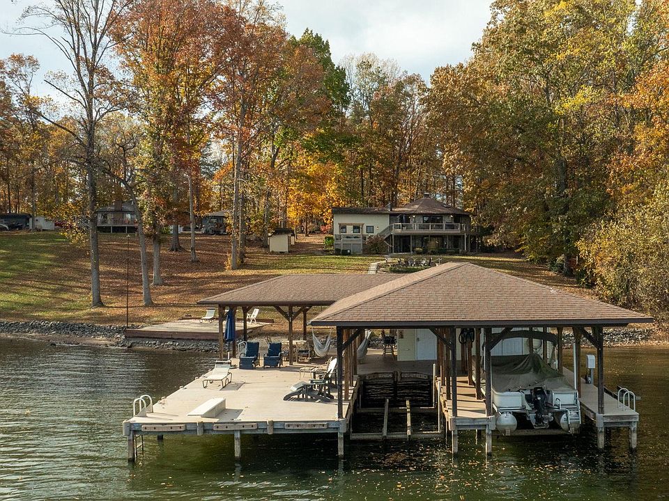 Covered boat slipsSpacious sunbathing platformAdditional living spaceBuilt-in barPanoramic lake viewsAttached garageCustom stone patio