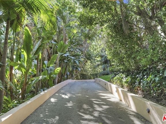 With an approach reminiscent of The Beverly Hills Hotel, this beautiful Contemporary Villa sits beyond private gates at the end of a long driveway framed by towering palm trees . The gallery entry leads to a grand scale living room with a fireplace. The formal dining room features high beamed ceilings and oak floors. The cooks kitchen opens up to a trellised patio with a built in barbecue. The 4 bedrooms include a master suite featuring an Italian travertine bath and a large walk in closet. Two of the guest suites have a media room attached with french doors opening up to the lush pool area. Upstairs you will find a large family room which is great for entertaining but could also potentially be another master suite. This spacious home is perfect for those seeking serenity and privacy.
