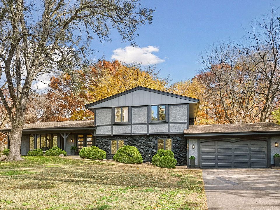 This Beautiful Minnetonka home has been amazingly transformed top-to-bottom with Modern Design and appeal and is conveniently situated on a gorgeous, private lot. The cul-de-sac location is just minutes to downtown Wayzata and is blessed by a 2/3 acre level backyard (pool compatible) that backs up to a wooded area. As you enter the home through the custom front door, you immediately notice the desirable open floor plan. The custom kitchen boasts stainless appliances, white quartz, white cabinets, and hardwood floors. This beautiful 4-level has it all! Huge bedrooms, a bar, mud room, 3 public spaces and so much more!