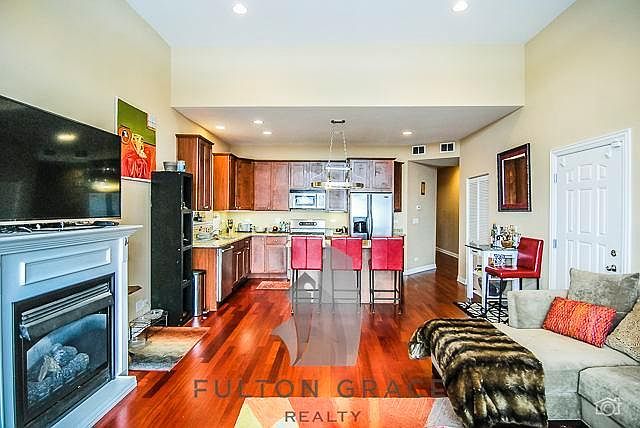 Lovely 3 bedroom, 2 bath penthouse unit in Logan Square! Parking included! Unit features 3 large bedrooms (each able to accommodate king-sized bed), with a large private balcony off the master bedroom. Brand new washer and dryer in unit, central heat and air, Brazilian cherry hardwood floors in common areas and carpet in the bedrooms. High-end Bosch stainless steel kitchen appliances including a dishwasher and garbage disposal and granite countertops throughout. High cathedral ceilings in the living room with a fireplace and a balcony. Steps from Koz Park and brand new Cermak Produce and Binnys, with great views of the city! Elevator building, and pets welcome! Must See