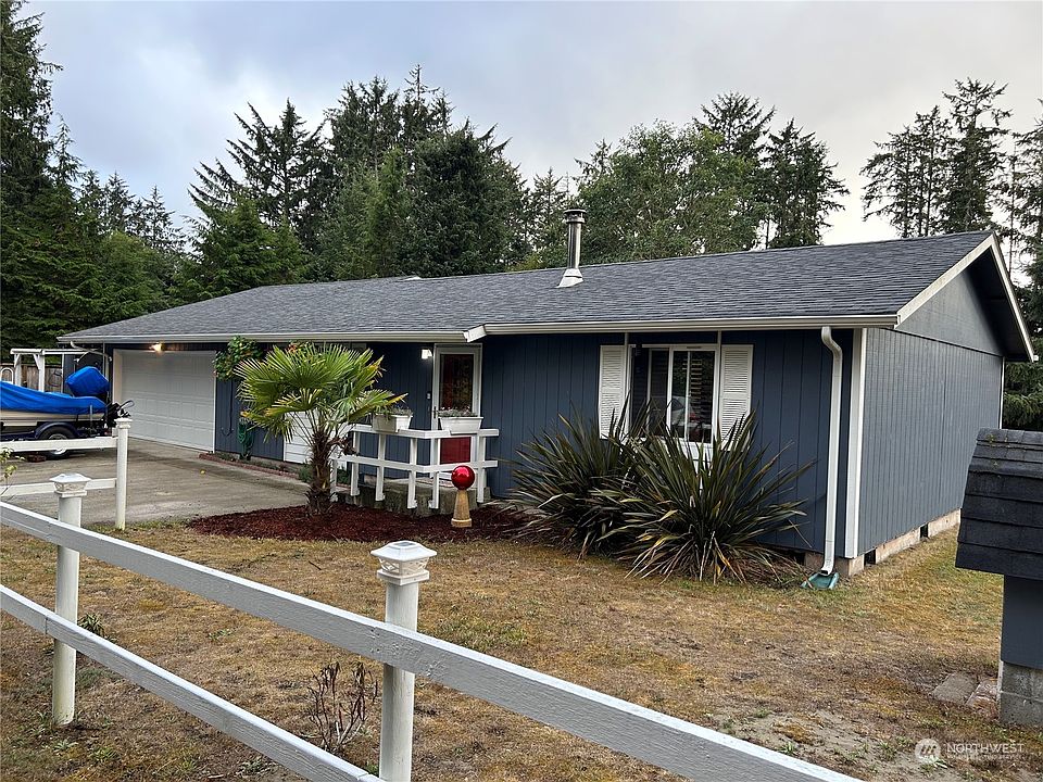 Privately located one level, ranch style home with 2 generous sized bedrooms, 1 and 3/4 bathrooms on a level 10,000 sq ft lot. There is a 2 car oversized, insulated, attached garage with a laundry room and 3/4 bath with shower. This home has a cozy open floor plan with wood stove for those cool winter evenings. There is an extra large driveway to accommodate several cars, an RV, boat and other toys, plus a huge, fenced, back yard with large patio, fire pit, and lots of room for gardening. Also included is a 10x12 shed with electricity for storage and projects. Come see this uniquely located, PRIVATE, well cared for home.
