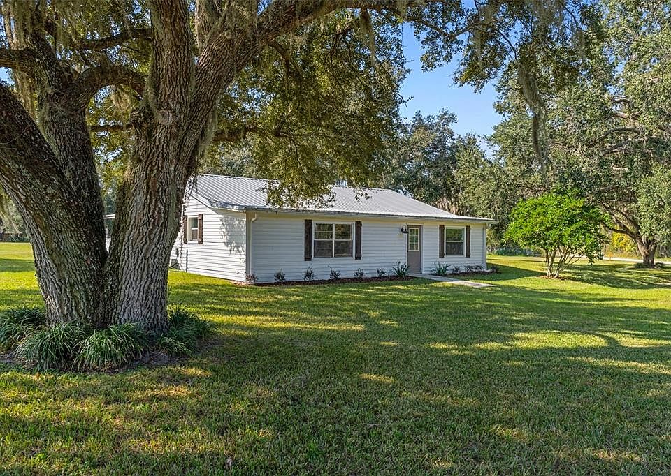 COUNTRY LIVING WITHOUT THE DRIVE! This fabulous Pool Home is nestled on 1.4 High and Dry Acres accented by scattered Oaks and conveniently located minutes from vibrant Retail and Dining, top Medical Facilities and numerous Commercial Entities in addition to countless Activity and Entertainment Venues as well as Parks and Nature Preserves! Featuring an Open Living Floor Plan, this 3 Bedroom Beauty offers loads of Natural Light and Numerous Upgrades throughout! Enter into an adaptable Flex Room - ideal as a Sitting Room, Family Room or Playroom! The spacious Great Room flows seamlessly into the Kitchen and Dining Room. The Kitchen boasts an abundance of Wood Cabinetry and Granite Counterspace, a Decorative Tile Backsplash and 2 Built-in Pantries in addition to a handy Drop Zone and a designated Coffee Station! The versatile Dining space is perfect for casual Café Dining or can accommodate a more Formal setting! The Primary Retreat includes a Walk-in Closet and an en Suite Bathroom with a Dual Vessel Vanity and a Tub/Shower combo with Tiled Surround! The oversized Secondary Bedrooms are situated to maximize privacy and include wide Built-in Closets! Recent updates include: Remodel of Kitchen and Bathrooms, Luxury Vinyl flooring throughout, replacement of AC Ductwork and Water Heater, new Lighting and Blinds throughout, Resurfacing of Pool and new Pool Pump…..and so much more! The durable Metal Roof and Double Pane Windows assist with keeping Utility Bills at a minimal! Outdoor Living is comprised of an expansive Covered Lanai overlooking the sparkling Sun-Splashed Pool and lush Green Space that is fenced for both Privacy and Safety! For the Hobbyist, there is a detached enclosed Workshop with electric service! With plenty of space for Play, Gardening and furry Two/Four-legged Friends as well as ample space to park a Boat, Trailer(s) and/or RV, this beautiful property is sure to impress!