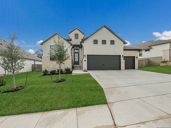 Welcome to your dream home in the highly sought-after community of Hastings Ridge at Kinder Ranch! This home perfectly balances luxury and comfort, offering 3 spacious bedrooms, an office, and a media/game room all on one level. Step inside to a light and bright open-concept layout, where the living room features a gas fireplace, vaulted tray ceiling, and abundant natural light. The gourmet kitchen is a chef's delight, boasting an oversized island, gas cooking, stainless steel appliances, quartz countertops, and extended cabinetry for added storage and workspace. The spacious primary suite is a true retreat with dual walk-in closets, and a spa-like ensuite bath featuring separate vanities, a large soaking tub, and a standalone walk-in shower. The three-car garage offers ample space for vehicles and storage. No city taxes and access to top-rated Comal ISD schools! This is where your next chapter begins!