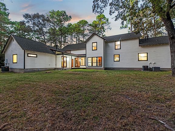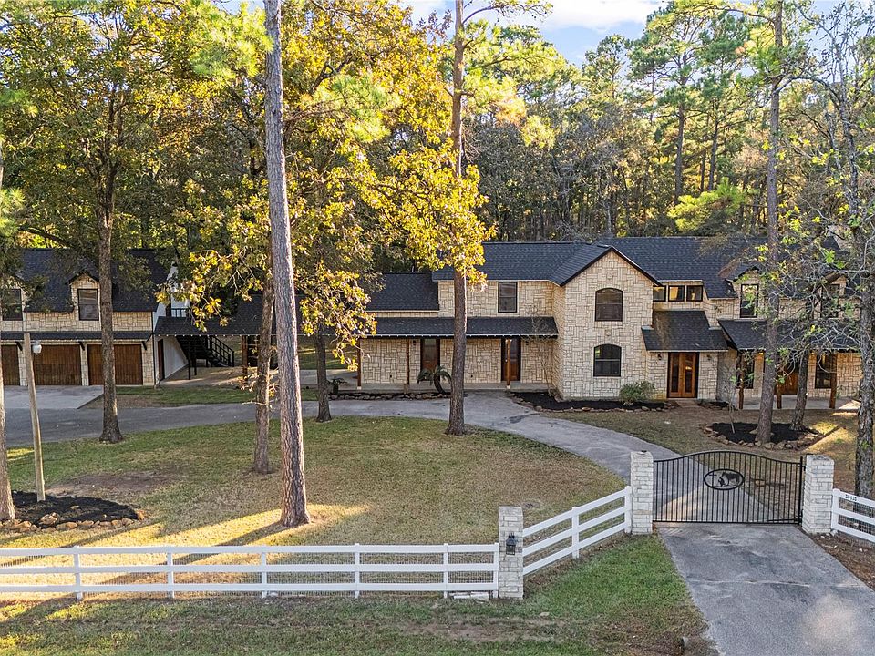 Bring your family and your horses home to this unique hill country style home in the coveted Indigo Lake Estates! 4 bedroom, 4 full & 2 half bath, 3 car garage with guest apartment and 2 bonus rooms sits on 2.78 acres with plenty of room for family, entertaining, and horses. Recent updates include roof(2025), interior and exterior paint(2025), A/C(2024), & luxury vinyl plank flooring(2025). Private primary bedroom feature beautiful stone fireplace, jetted tub, separate shower, and patio access. Living area features stunning 2-story fireplace with lots of natural lighting, vaulted ceiling with beams. Spend your down time swimming, boating, skiing, and fishing at the 40 acre lake, picnics at the beach park with pavilion, or riding through the scenic riding trails and arena. Country living with minimal commute to Cypress, Tomball, The Woodlands, and Houston.