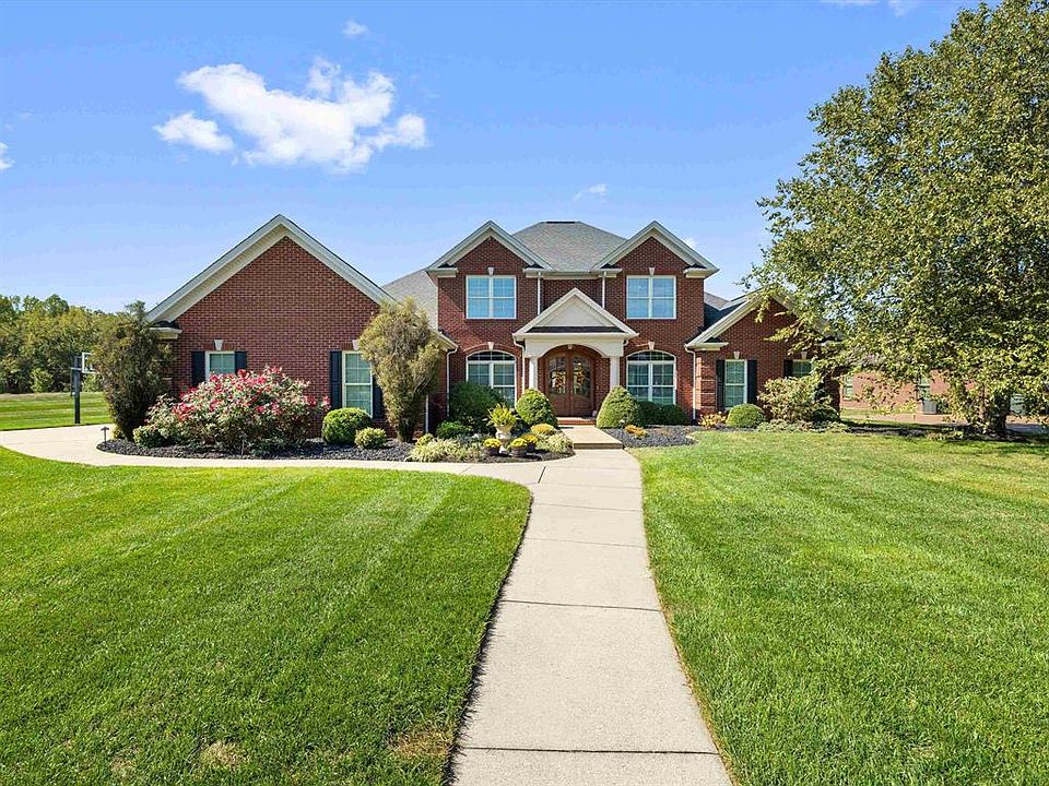 Welcome home to Hunters Ridge! This 4-bedroom, 2.5-bath property showcases thoughtful details throughout, including Amish custom cabinets, built-in bookcases, engineered hardwood floors, and a ceramic tile shower in the owner’s suite. The spacious owner’s suite features his and hers walk-in closets, while the upstairs boasts a convenient laundry chute and a flexible 5th room that can serve as a game room, playroom, or additional bedroom. With a media closet, indoor/outdoor surround sound, central vacuum system, and geothermal heating and cooling with cellulose insulation, this home is designed with both convenience and efficiency in mind. A rare 5-car garage provides ample parking and storage. Step outside to your private backyard oasis with a professionally landscaped setting, in-ground pool with diving board, covered patio, and a built-in Weber gas grill with natural gas hookup—perfect for entertaining. Enjoy peace and quiet on a dead-end street with minimal traffic, while still being part of a friendly neighborhood. This home also includes modern upgrades such as a generator hookup, ventless gas fireplace, and abundant storage space. With quality construction and upscale finishes, this Hunters Ridge beauty is truly move-in ready. Trade Plan Available!